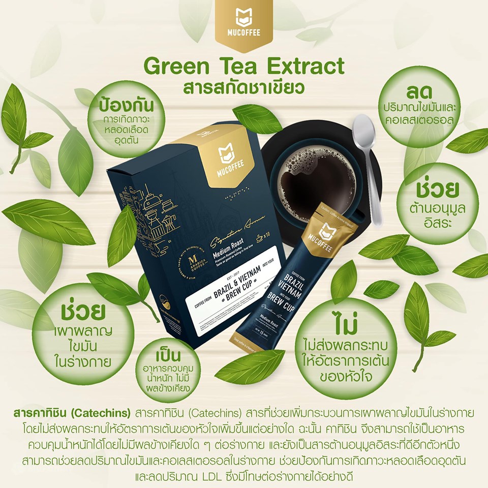 ชาเขียวคุณสมบัติดีต่อร่างกายมากมายอยู่แล้ว เป็นที่ยอมรับกันทั่วโลก เราจึงนำมาเป็นสารสกัดใส่ในมิวคอฟฟี่